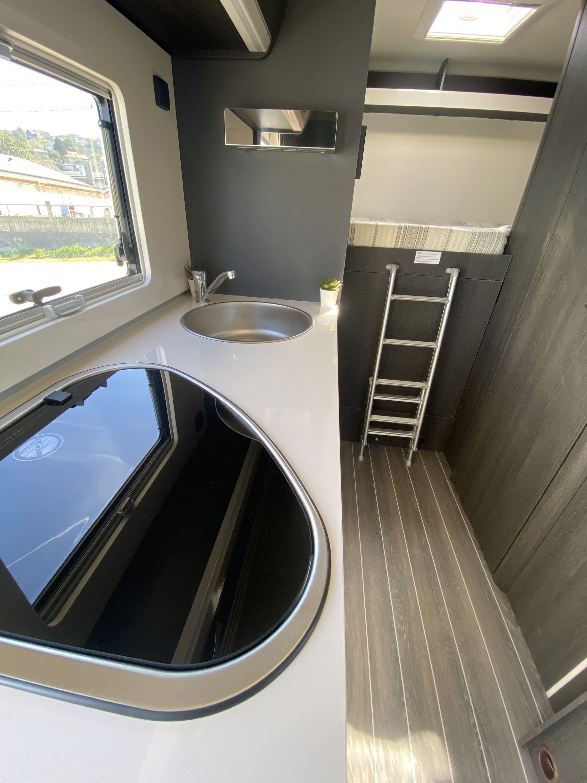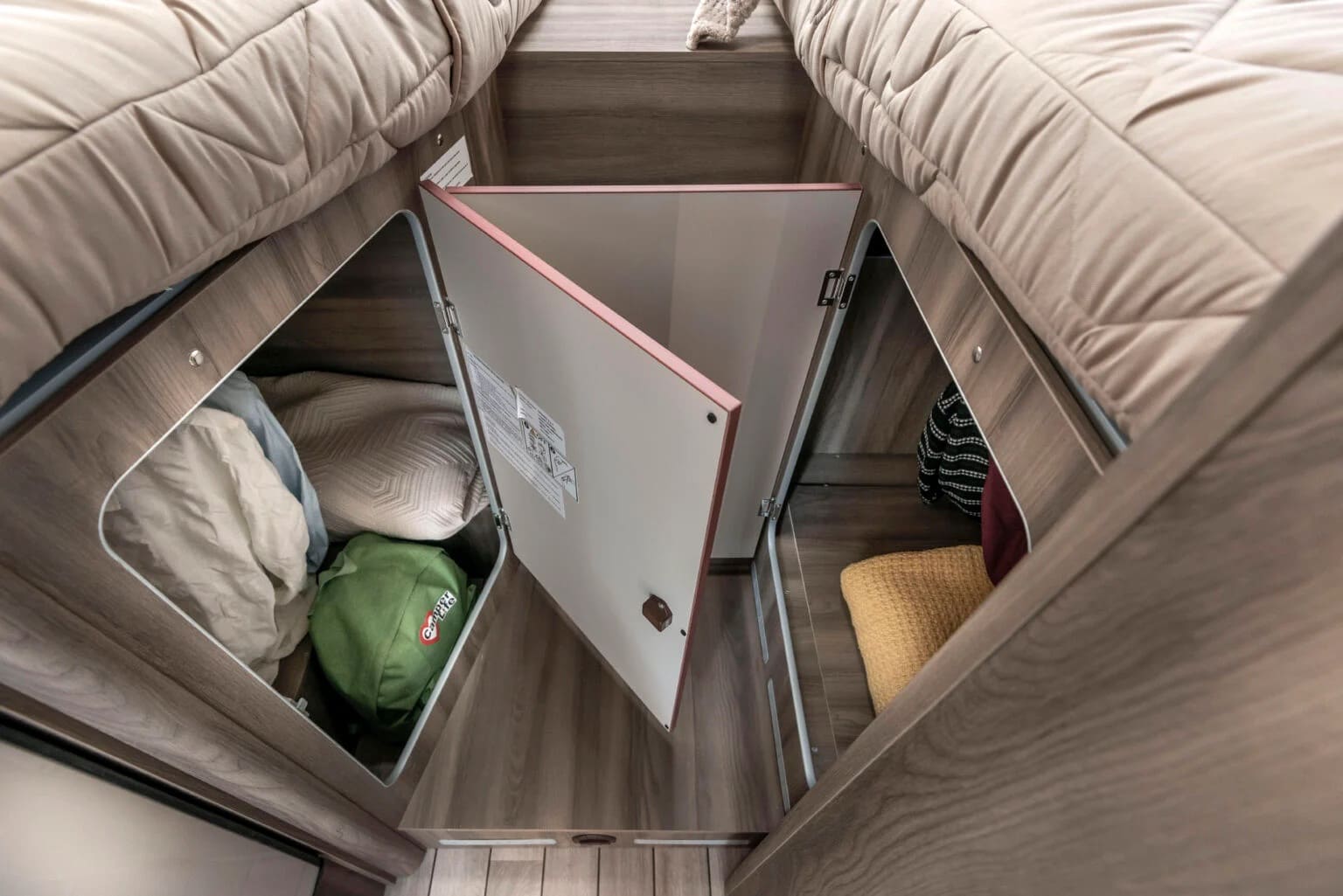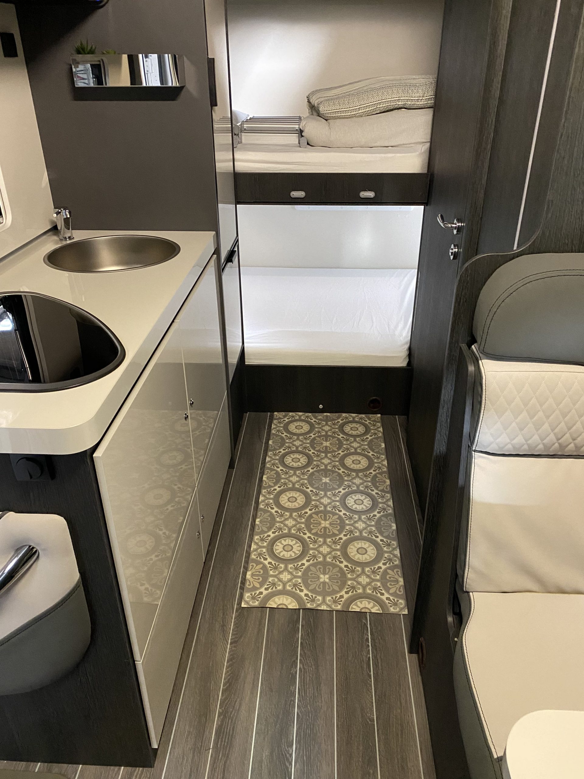 - Equipo multimedia con bluetooth, salón, cama trasera transversal de matrimonio 140×200, opcional de litera en las mismas dimensiones, asientos delanteros giratorios.