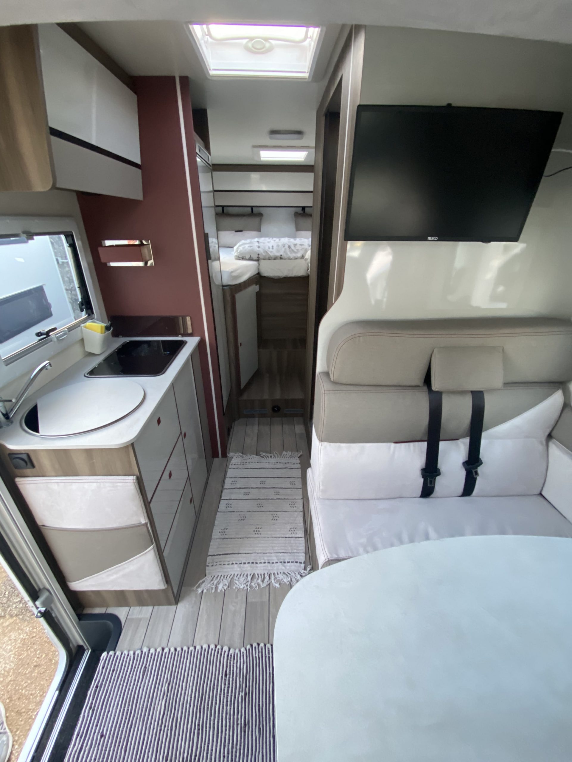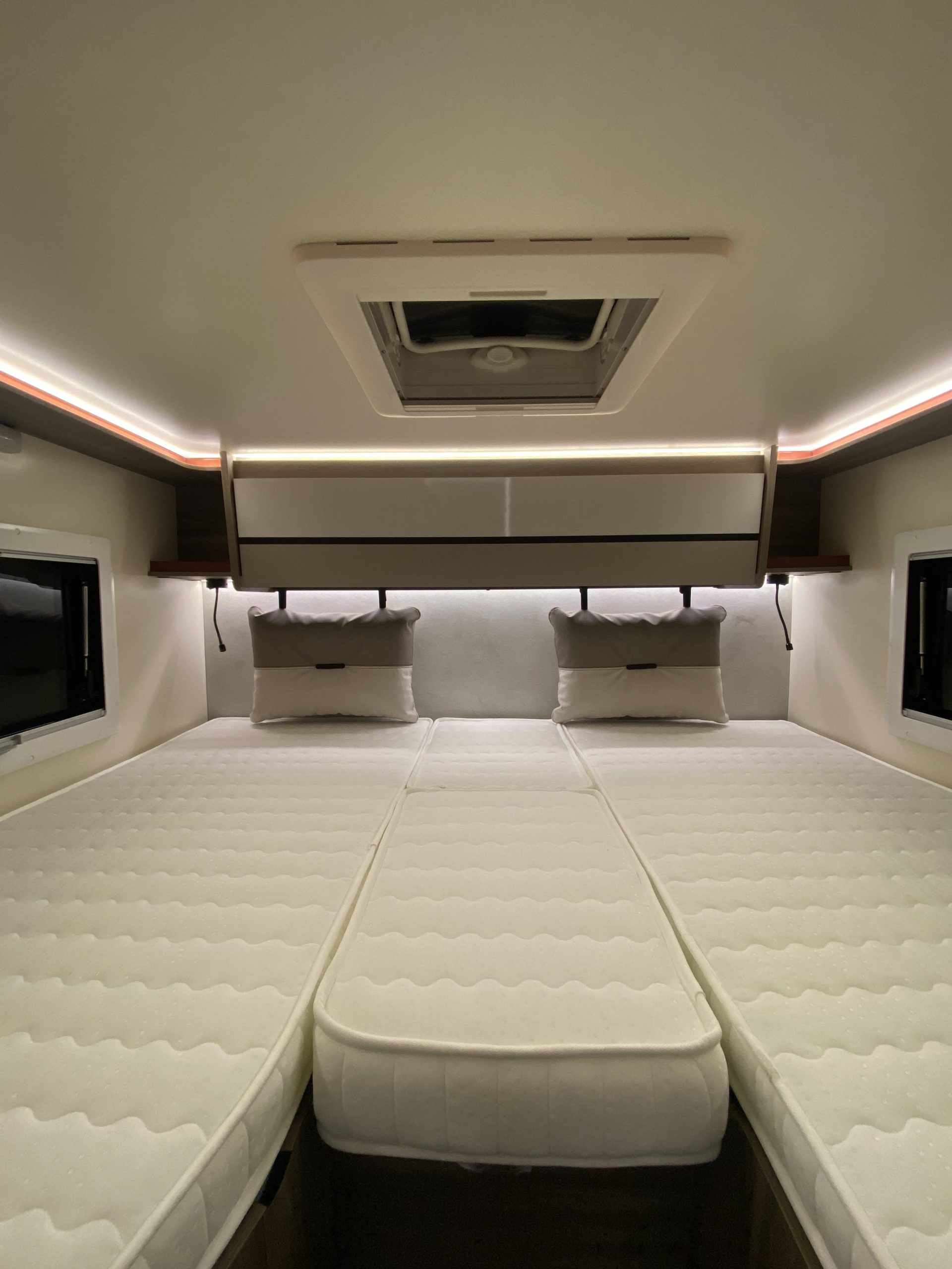 - Equipo multimedia con bluetooth, gran salón, camas gemelas en la parte trasera convertibles en cama de matrimonio 200×200, segunda cama individual es suspendida eléctrica en el salón(85×191), asientos delanteros giratorios.