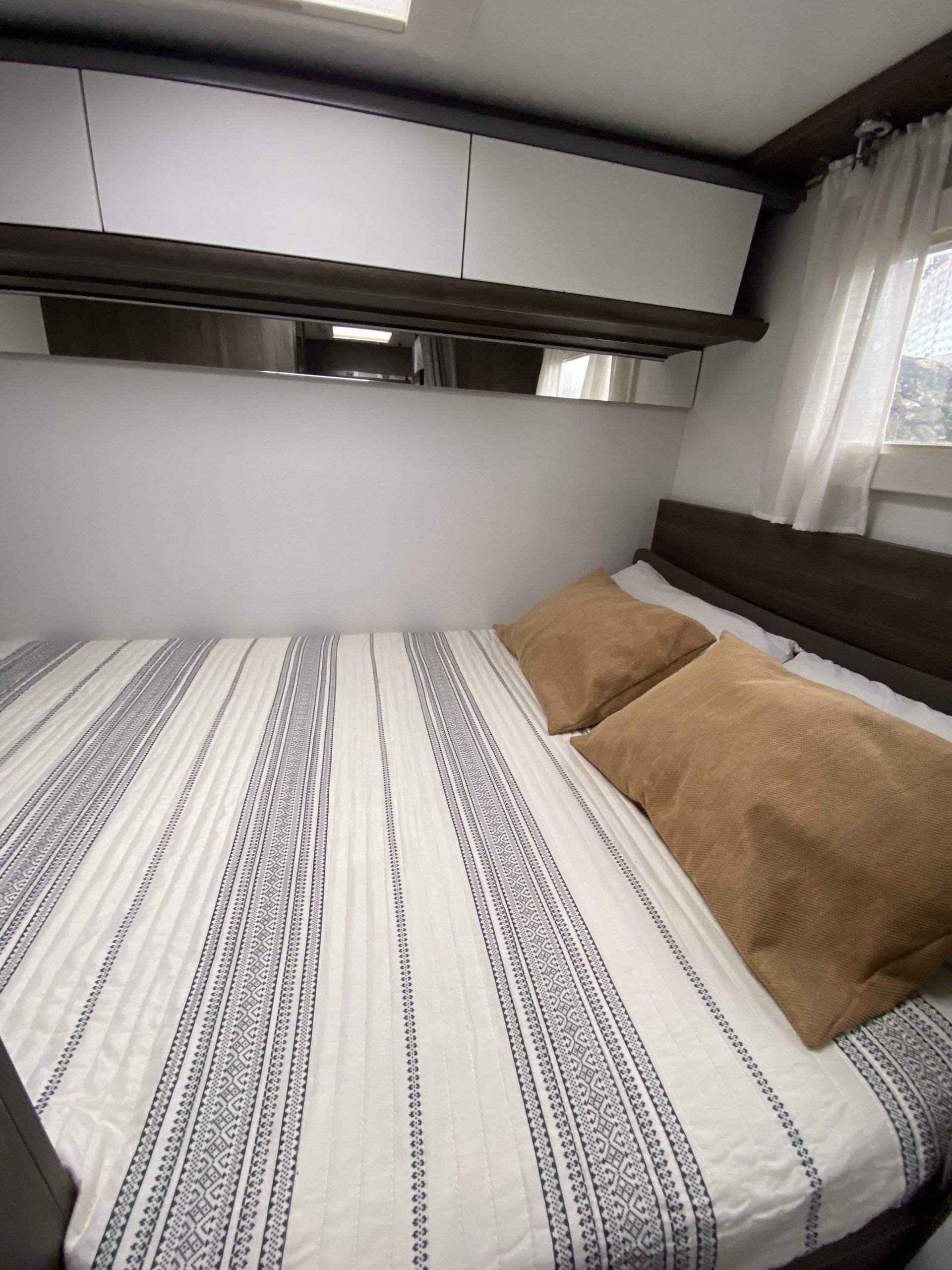 - Equipo multimedia con bluetooth, gran salón, cama trasera transversal de matrimonio 140×200, cuarto de ducha separado del aseo, la segunda cama es suspendida eléctrica en el salón(140×191 máximo 230kg) y para dos personas, asientos delanteros giratorios. Opción de tercera cama individual convertible en salón.